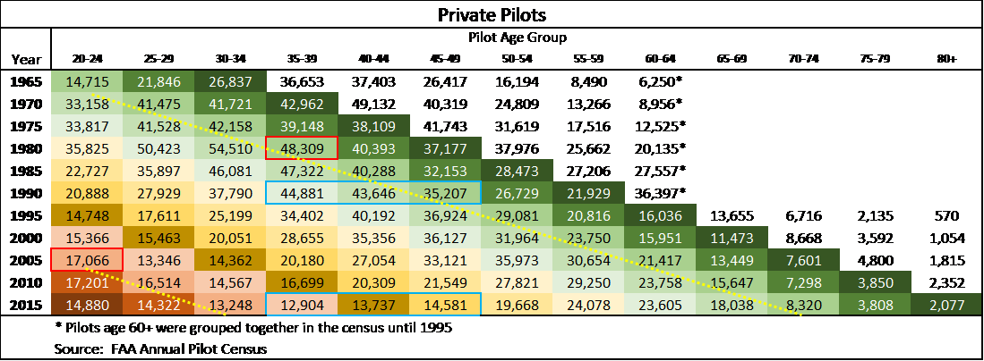 Using the data, it is possible to follow a particular group as it grows and shrinks through time. For instance, 20-24-year-olds in 1965 made up 14,715 pilots, grew to a maximum of 48,309 by age 35-39, then eventually shrank to 8,320 in 2015. Several groups saw this same type of growth with their numbers peaking in the 30-34 and 35-39 age brackets. The younger groups have not seen similar growth recently.
