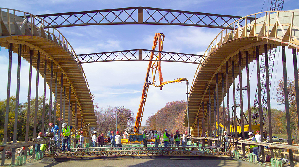 Functioning reinforced concrete through arch design. The arches are largely reinforced with structural steel trusses designed as self-supporting during construction – no falsework in the channel was required to build the arches.